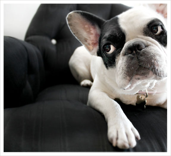 I came home last night to my very naughty Frenchie Bella leisurely reclined on one of the pairs of my black silk vintage club chairs. Even if she had a glass of vino and cigarette in her paw she couldn’t have looked more relaxed. Did she jump abruptly off the furniture in a moment of panic and guilt when she spotted me? Nope. Bella knows better than to be on the chairs, she sheds like crazy and white shedding Frenchie plus black furniture is a no-no. These chairs will one day be re-upholstered in a natural Belgian linen (one mystical, magical day when I come into some excess cash…). I digress…I wanted to scold her and remind her that I have lambasted her father (the Fancy) for lesser infractions, but whenever she tilts her head just so and gives me that ‘What me? Did I do something wrong?’ look she gets yet another free pass to bad behavior. I’m an enabler, it’s true.