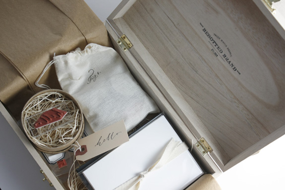 I sent out these pretty parcels to some of my favorite bloggers last week (I still have a laundry list more to go, but ahem the budget is a tad constricted right now. In my haste I did send the wrong note + package to the wrong recipient which is such an outrageous blunder, but no one has mentioned it yet, so either they didn’t mind or expect me to be a bit scatter brained. I still owe the original blogger one. I do plan to sell gift packages like this in the shop, they may not be exactly the same, they may be even better, yes indeed. I love the idea of easy gifting, anything that takes the angst out of finding the perfect gift is all right in my book. May I point out the notecards in this photograph? They are the Besotted Brand signature stock and they are so luxuriously thick, the individual on the receiving end of your card will absolutely comment, I haven’t had one person not mention how perfectly thick they are. For the purposes of using them with the Besotted Brand hand stamps they are also perfectly smooth. I tried countless cardstocks before I created these notecards, I was like the Goldilocks of paper, nothing was quite right and then I came across this one mill that had stock so gorgeous that I immediately ordered their outrageous minimum orders worth. I must sell it or else my future children will not be going to college. Yes, I made a hefty investment thus the budget constraints mentioned up above. I believe it was worth it, I am a paper-phile and if this stock made my heart sing I am sure it will do the same for others with my same affliction.