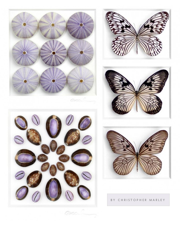 I’ve seen the work of Christopher Marley floating around the interwebs for a little while now, but it wasn’t until after I saw photos that Christine of Greige took at a tradeshow that I was compelled to put something together (the feathers!). My problem was I found every one of Mr. Marleys creations so beautiful, fascinating and unique I wasn’t sure what to group together to showcase. I did my best, but you really should go visit his gallery to get the full impact. For those that collected seaglass, shells, and other souvenirs of summer I think it would be lovely to create your own arrangement in shadow boxes to preserve those memories and put on display; it could be a sweet project to do with the kids or even to just wind down at the end of a hectic week. I am not much of a collector (unless you count books), but I think a wall of Christopher Marley works would be divine. Do you collect anything and display it in an innovative way? This has truly inspired me to try a little harder in the creative department!