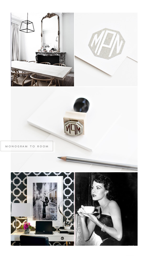 I wanted to try something different when I showed off the new monogram designs here. This is my version of a monogram to room inspiration board. I feel like this monogram is modern yet glamorous and the platinum ink fits with the design effortlessly. The person who chooses this monogram would like both traditionally glam items like the antique french mirror but also appreciate modern design. A monogram by nature is classic, but in this shape it gets an update to the 21st century. This monogram belongs to an individual who prefers sleek to frou frou, but has no qualms about something with a little sparkle. It’s unique and not everyone would have it and that’s exactly how she would like it. The winner of this monogram is Michelle P., congrats Michelle!
