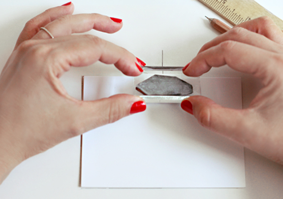 Ink your stamp, put your chosen cardstock on top of your template and you will see your center guideline clearly. Gently, but firmly press your stamp where in the center you would like your artwork to be, lift up (do not rock or jiggle). You should have a beautiful + centered impression!