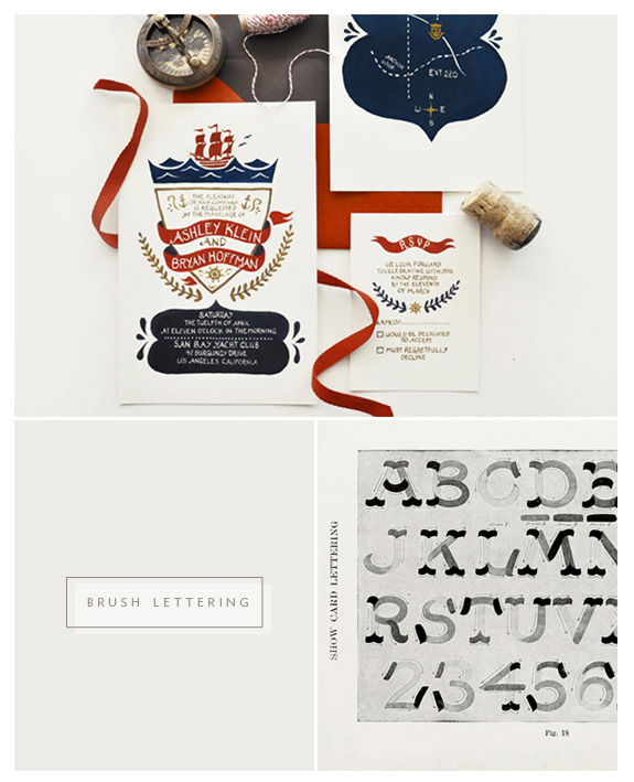 It’s Thursday and I am going to try to stay on topic as promised and bring you more hand lettering resources + how-to’s. The lovely top image above is by Quill & Fox, a very nice specimen to discuss the currently wildly successful lettering trend of brush lettering (I don’t know if that is its ‘proper’ name). I am sure you have heard of a little company called Rifle Paper that utilizes this ‘painted’ script very well, as does Meg Gleason of Mogela. I think this sort of imperfect hand adds a wonderful charm to your project. I searched the interwebs hi + low and had a very hard time finding what types of brushes, paints to use etc. I even tried some samples of my own with less than favorable results. Then I came across a wonderful resource for you from the Open Library a book (available to view for free on line) called The Art of Show Card Lettering. The book is copyright 1922, so it is a bit older, but it still has great specimen charts like the one on the lower right, with stroke direction (very helpful). It also has tips on brushes and how to hold them to get the most desirable outcome. It’s not modern by any stretch, but it’s still a wonderful resource for those wanting to delve into script with a brush. Amanda of Wit & Whistle has been trying her hand at hand lettering with gouache (the same medium Rifle Paper uses) and she chronicles her results here. I am all for trying new lettering techniques and this is definitely one of the styles that I would like to be able to master. If you are looking for more inspiration I have a TON on my hand lettering board on Pinterest, where I have been pinning away like it’s my job (wouldn’t that be a cool job?). Let me know if you have any tips on this style of lettering, I would love to know more!