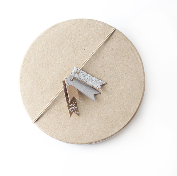 The other night when I was wrapping gifts I was thinking wouldn’t it be so cute (I’m all about cute), to have some kraft flag gift tags? (say that 5 time fast). I happen to be the owner of a ton (no exaggeration) of chipboard, because as you know I love me some industrial. I started to tinker, as I have a black belt in tinkering and my flags were terribly wonky at first, then I tinkered some more and had my light bulb moment and created my template. After that I was churning out chipboard flags like my own little factory. I even got my husband in on the action. I like working with my hands and I LOVE problem solving, it’s the way my brain works give me a problem (albeit nothing of the arithmetic variety) and I am a happy camper; thus, my little flag factory was born. My brain started firing off, the way it does, in 40 different directions and I knew what potential these had for crafting goodness. Just so you know, I am not a great traditional gift wrapper, do not give me a piece of wrapping paper because your gift will look like it was run over by an eighteen wheeler. I like simple + easy. If I can do this you can surely surpass my efforts, so without further ado here are some ideas to use these new flags in your future gifting endeavors!