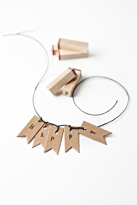 I cut the notched part of my flag tag off, punched some holes + used the new mini alphabet set (san serif) to create this garland. I want to try the mini Circus alphabet set and do some embossing next time. The best (and my most favorite) part of stamping is that I can use any color + stamp on something this tiny. Don’t worry, you won’t ruin the other part of your tag that is remaining, just punch a hole on either side, run some twine through and you have a very cool + modern tag for your gift!