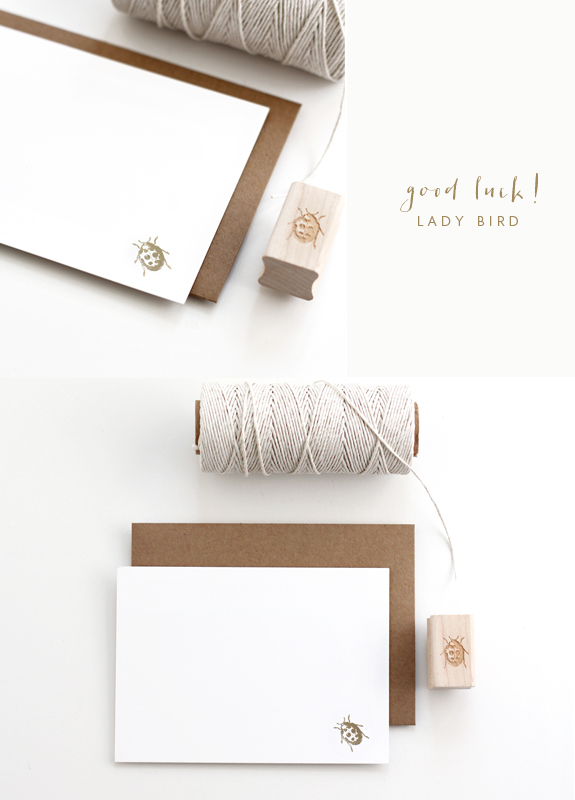 Since moving to the South I have seen such a variety of insects the likes I have never known. The butterflies here are big, bright and beautiful (I catch a glimpse of at least a dozen each day), the dragonflies with their iridescent bodies and gossamer wings make you sigh with delight. There’s other varieties of insects too that I don’t care much for but I won’t get into them here! I have always had an infinity for the lady bird, those teeny tiny little polka dot beetles that have been purported to bring luck to the recipient who spots them. I made the artwork on this stamp small enough so that it adds just a hint of whimsy to your correspondence, but would look darling on a tag for homemade jam or even on cloth napkins for an end of summer soiree. Is summer really ending? It seems both too soon and not soon enough as it has been a scorcher here. I am not used to seasons so all this talk of fall has me excited for another new experience. I am wishing you all a lovely weekend! I shall be practicing my lettering, working on the re-design of the blog (never-ending!), prepping for the upcoming Souvenir Foto School session and maybe getting to spend a few precious moments with my fur babies and patient + handsome husband!