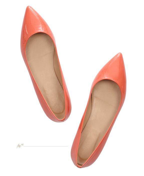 I don’t think anyone would be surprised if I mentioned that I didn’t have much color in my wardrobe. I am pretty classic in my style and usually don’t buckle to trend. I have dark blue jeans, white shirts, camel trench coats, navy dresses, stripes and polka dots as my only pattern options. Everything is in a neutral palette and everything works well together. I don’t own a lot of clothing either, just the perfect amount of pieces that I can mix and match. When I moved to the South they did make me check in all my black clothing at the border, less one Little Black Dress as every woman Southern or otherwise should own an LBD. Instead of black I wear navy. I am fine with this change. I think I may have had a little shock when I first went to the mall and saw that it was an explosion of color and pattern the likes my urban eyes had never seen. I would have felt like a shrinking violet in the sea of sassy, but I am not all that boring, I do usually have a hit of color on my feet or waist. Somehow I feel like I am getting away with something. I have an extensive shoe collection and it seems to me I favor red to any other color. It’s that tiny pop that feels so unexpected and works so well for me. I like yellow too, but haven’t found the perfect pair of yellow shoes, but when J.Crew showed off these new orange pointed flats it was the perfect combo of red + yellow=my new fave shoe. The pointed toe is nice and retro and a little bit more dressy than my usual casual round toe flat. I am taken with these beauties. I have a nice pinboard ode to the ‘flat’ you can spy here and if you want a peek into my closet, my ‘closet case’ board pretty much nails my style down to a ‘T.”