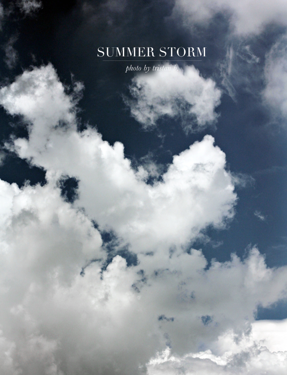 Last night may not have been the worse storm since we have been here but it certainly was the loudest! I had B. wrapped up in her Thunder coat, a magical invention if there ever was one. I laid there in the dark just listening to the roar of the thunder, the lightening bright even behind my closed lids. I love the sound of the rain, the cool breeze that wafts into the bedroom through the open window; the smell of wet earth, wood and pine is not too shabby either. It’s supposed to rain all week, so I will have lots of time to take in more clouds, smells and sounds. I think I might even take some time this week to paint. I am certainly feeling inspired and the cloud study is definitely a beautiful reference point, but I won’t try to recreate it as I think that Mother Nature already perfected those images and I could do nothing to add to their beauty but I have some ideas that I want to play with and besides it’s always a good time when you break out the paints and just lose yourself for a few hours, I highly recommend it. I am finding that studying painting helps me to become a better photographer, you notice light in new ways and you know I love me some good light. You? Will you be doing anything for yourself this week? Something creative or trying something new? It’s a short week it should fly by, it might be nice to take a little time for just you.