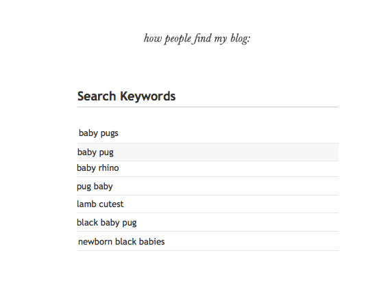 I am going to confess that I am no blogging expert. Sure, I have been blogging longer than most of you have been able to legally imbibe, but I am no expert. When I moved to the Blogger platform, I thought it would be a temporary stop on the information super highway and that I would be building my big, beautiful WordPress masterpiece within months. A little over a year later I am still here. Since I thought it was temporary I never really investigated the ‘stats’ option. I don’t really care, I don’t monetize this blog so as long as I get comments I am a happy camper. I have peeked under the hood (so to speak) a few times, mainly at the ‘key word search’ because I like to know how people find my blog. The few times I have, the search words have always amused me and I have thought to myself I should take a screen shot. I am a professional level procrastinator so that hadn’t happened, but today I did. For the record, the last search word combo, I have never had on my blog, although, I am a fan of babies-huge fan. I often wonder if the people looking for these search words are disappointed when they finally arrive? It’s one of the reasons I stopped doing my Cute Monday’s, because I didn’t want to lead anyone on that this was a mecca for cute; when it was really only a mecca on Monday’s. I also didn’t love that I couldn’t find the source of the cute any longer, it made me feel guilty and I have enough guilt being born Roman Catholic and married to a Jew, it’s like guilt on steroids here already. Speaking of guilt, I can dole it out as much as I can stew in it and I can not take it when people unfollow my blog, it ruins my day/night/month/life, if you follow it you know what it’s about and when you unfollow I lose my mind (and my self-esteem). So, please don’t follow me unless you are sure you like me, because I have a whole highschool thing I thought I got over, but the blogosphere has brought it out of me again, sigh. Does anyone else feel the same way or am I the sole neurotic on the web?
